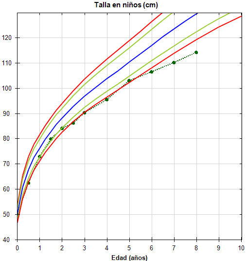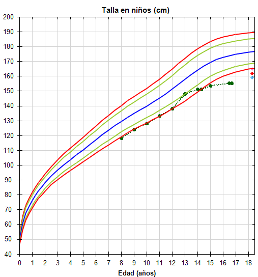 Esta es una gráfica de crecimiento normal. Niños y niñas crecen por intervalos, a veces más notorios que otros, pero lo importante es que se mantengan en un mismo carril a lo largo del tiempo. Esta gráfica es de una chica que está en la pubertad y su crecimiento se está acelerando, por lo demás una gráfica bastante normal.