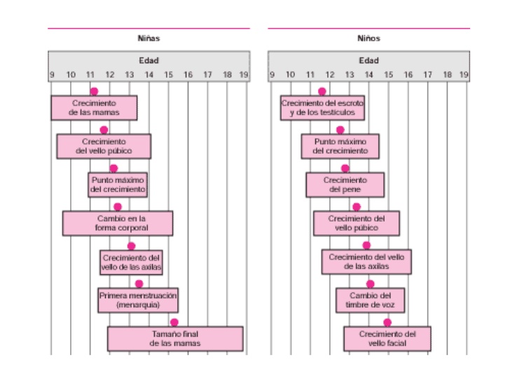 Como se ve en esta gráfica, hay un proceso de maduración que se da en edades particulares y en una secuencia determinada. Cuando el proceso se altera, suele haber una repercusión en el crecimiento.
