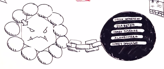 Pensemos por un momento en un pavo horneado, una pierna glaseada o unas costillas barbecue. Para que nos parezca apetitosa encontraremos un brillo muy particular en la superficie y hará que deseamos comerla. Pero si la dejamos un tiempo aún en refrigeración, en pocas horas ese brillo se vuelve opaco y le da un aspecto envejecido a la comida. Esas características son las de productos avanzados de glucosilación (conocidos como AGEs por sus siglas en inglés) y su característica es acelerar el envejecimiento de las células. En la comida que ingerimos no significa más que si no la consumimos pronto, su aspecto no será agradable, pero cuando se forman dentro de nuestro cuerpo, nos hacen envejecer. Pero sobre todo y de forma más importante, son estos los que causan las complicaciones crónicas de la diabetes.